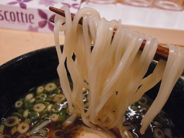 麺は中太の平打ち麺。真空ミキサーを使用しているそうで、やや透明感があり